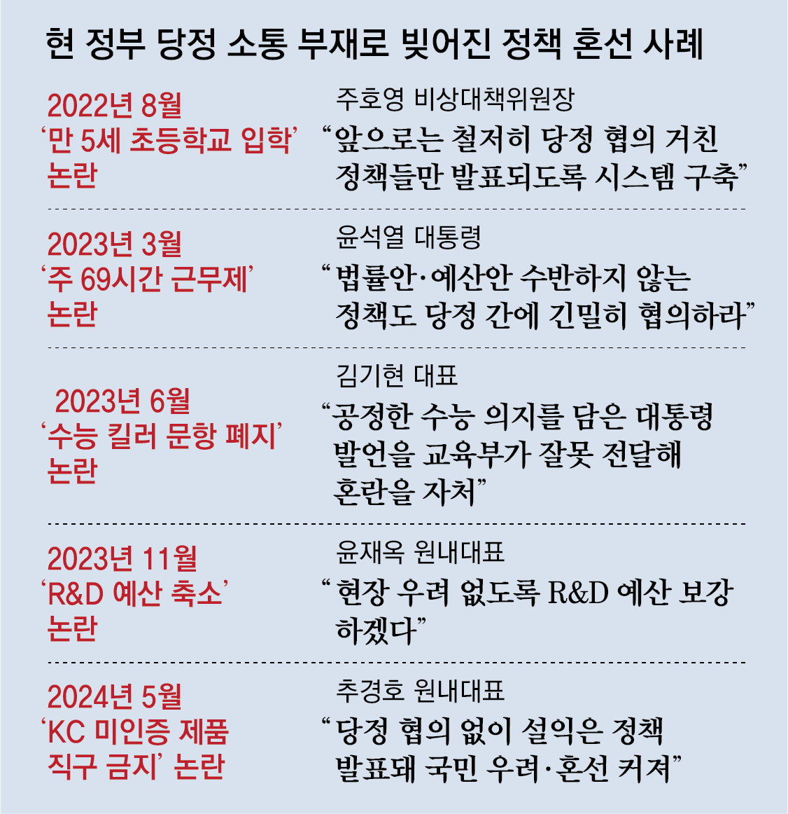 이같은 정책 혼선은 윤석열정부 초기에 홍역을 치렀던 만5세 초등학교 입학, 주69시간 근로제 등의 기존 뒤집기 사례도 재소환하고 있다. 여권 관계자는 “정부 출범 초기부터 정책 뒤집기가 이어지면서 준비 안 된 정부, 아마추어 정부라는 낙인이 찍혔다가 좀 나아지는가 했더니 또 시작되게 생겼다”고 우려했다. 총선 민심을 강타한 ‘무능’ 키워드가 이번 사태 때문에 또 한번 동력을 얻게 됐다는 것이다.