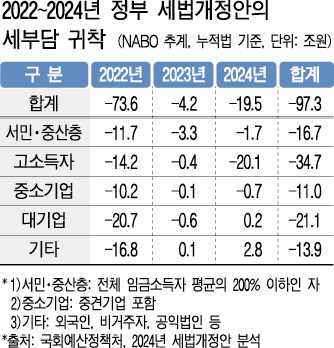 2022년부터 2024년까지의 정부 세법개정안의 세부담 귀착효과를 보면 감세효과가 고소득자 34조7000억원, 대기업 21조2000억원으로 각각 전체 감세액 97조3000억원의 35.6%, 21.6%에 달했다.