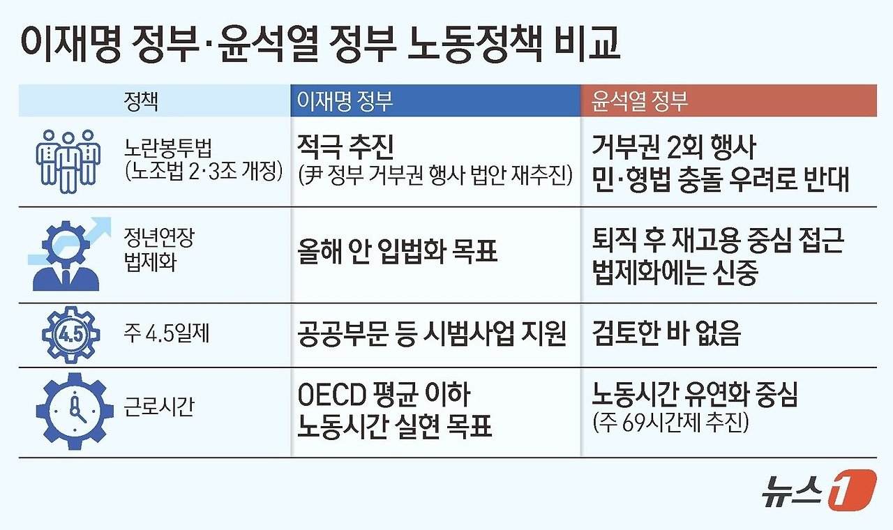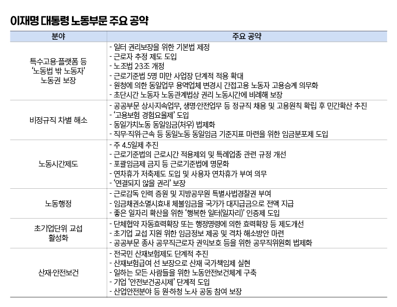 이 대통령은 후보 시절 노동 정책 공약으로 ▲노동조합법 2ㆍ3조 개정(노란봉투법) ▲주 4.5일제 ▲주된 일자리 정년연장 ▲장시간 노동 해소와 연차유급휴가 확대 ▲법정 유급병가와 상병수당 도입 ▲상시 5인 미만 사업장과 초단시간 근로자 근로기준법 확대 적용 ▲동일노동 동일임금 보편 규범화 ▲산업ㆍ업종별 단체협약 효력 확장 ▲대통령 직속 국가임금위원회 설치를 제시했다.