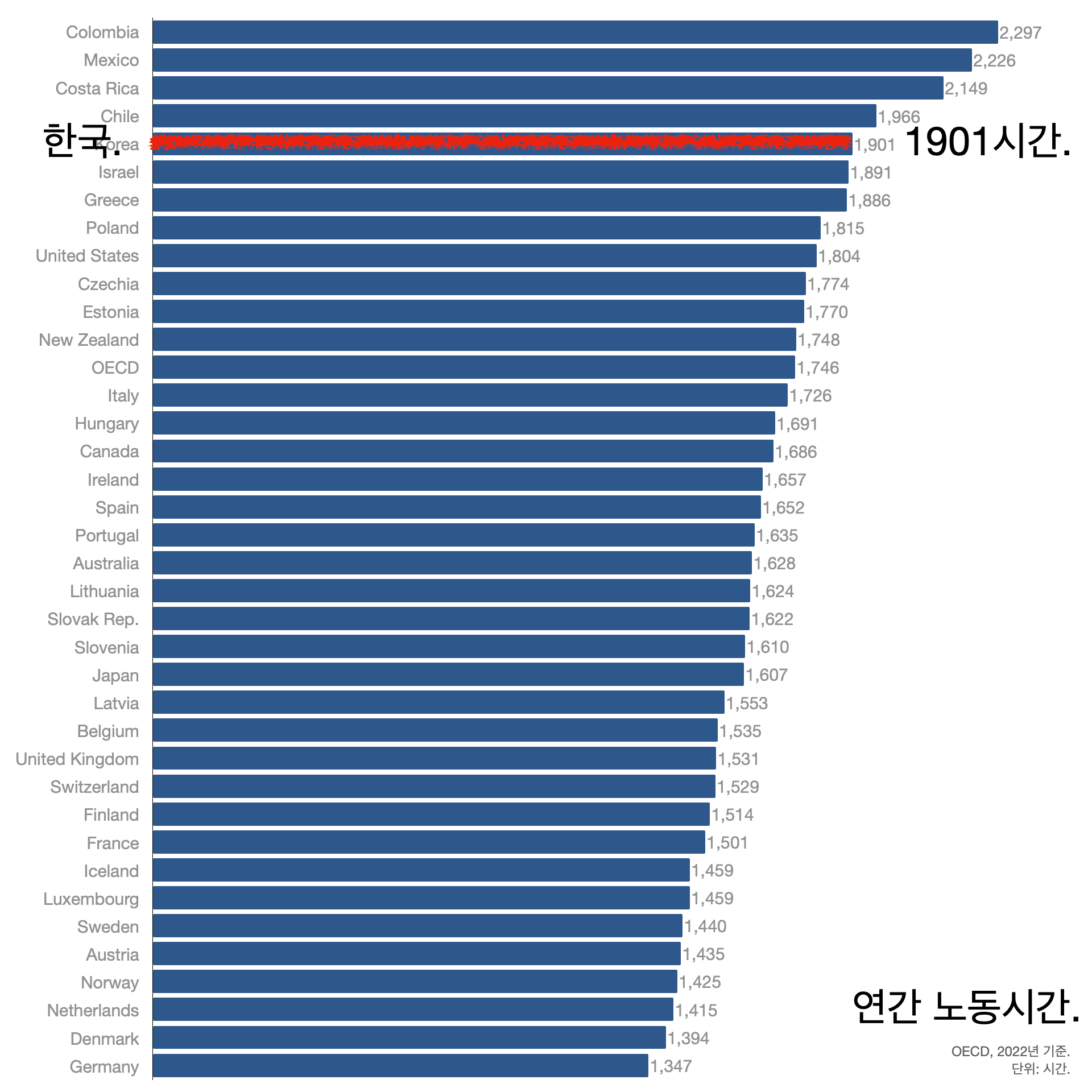 - 한국은 이미 세계에서 가장 오래 일하는 나라 가운데 하나다. 2022년 기준으로 연간 1901시간, 2023년은 1874시간으로 줄었지만 여전히 OECD 평균보다 150시간 이상 길다.