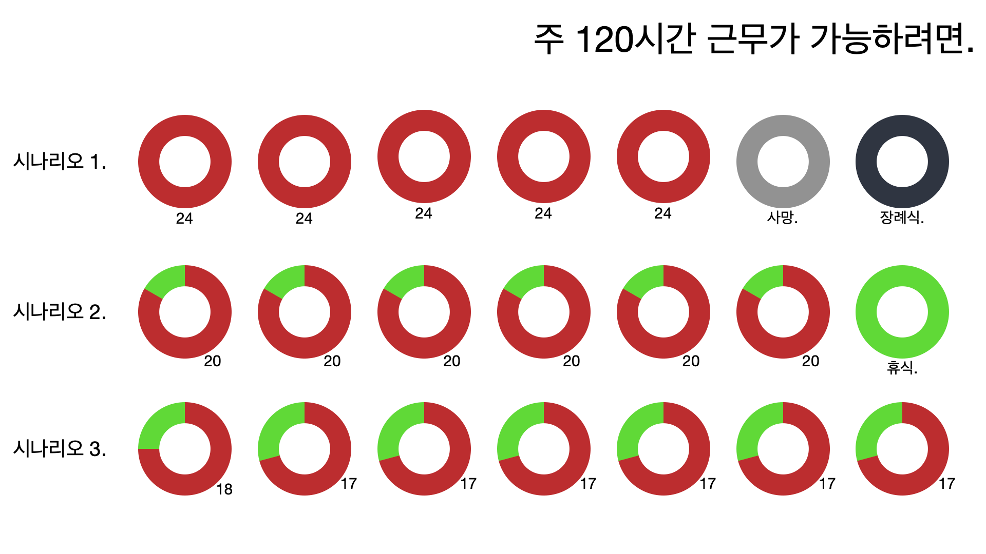 - 주 120시간이면 5일 동안 24시간 연속 일을 해야 한다는 이야기다. 금요일까지 일하고 토요일에 죽고 일요일에 장례식을 치른다는 우스갯소리가 나돌기도 했을 정도다.