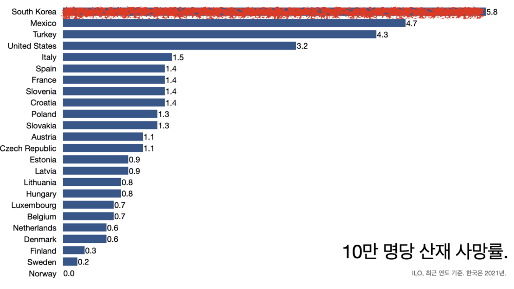 - 한국의 산재 사망자 수는 OECD 최고 수준이다. 해마다 등락이 있지만 여전히 10만 명당 5명 안팎으로 멕시코나 튀르키예와 비슷한 수준이다.