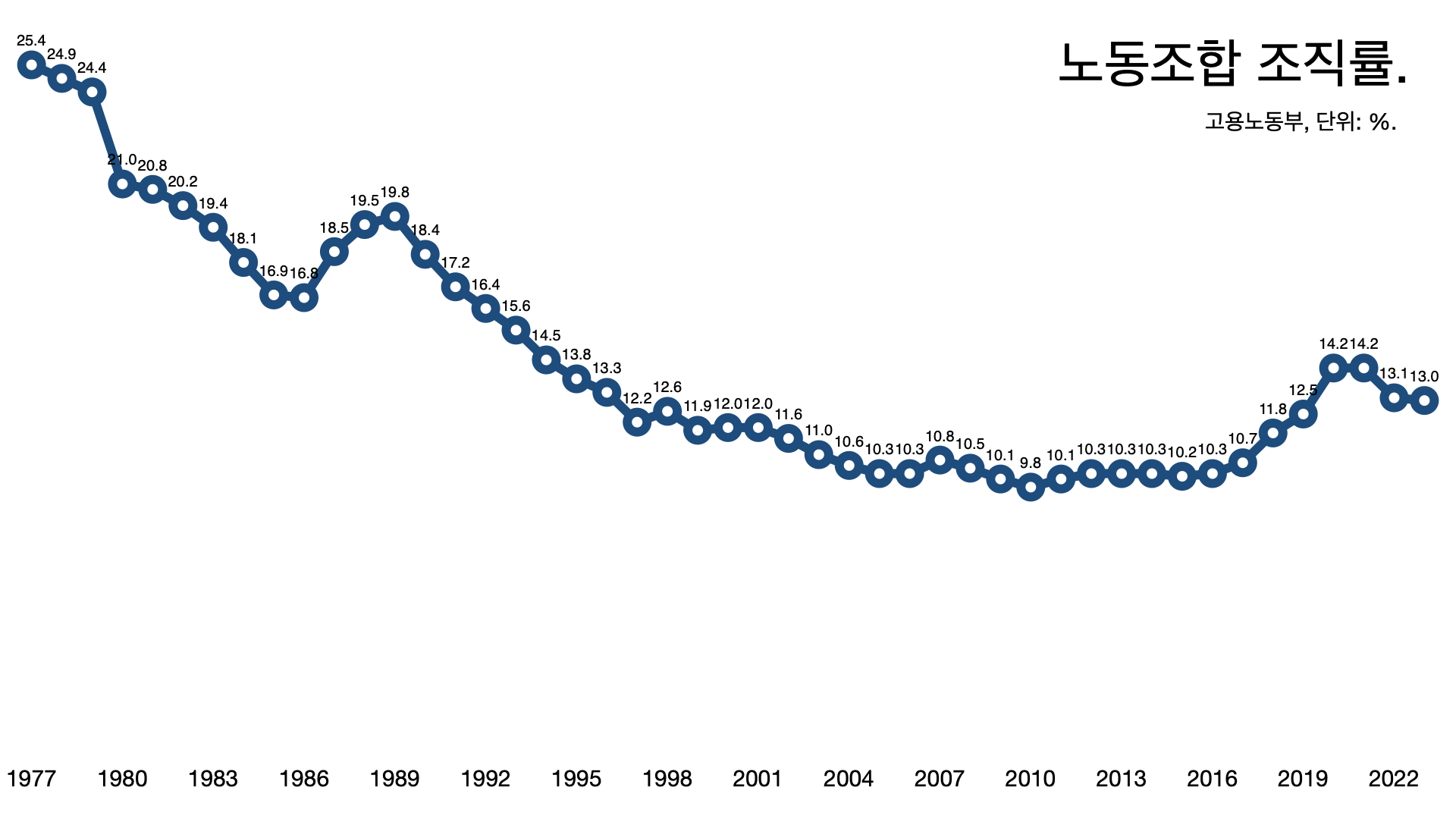 - 노동조합 조합원 수는 지난해(2023) 기준 274만 명, 전체 가입 대상 2103만 명의 13.0%로 줄었다. 한국노총과 민주노총 소속 조합원이 각각 116만 명과 109만 명이다.