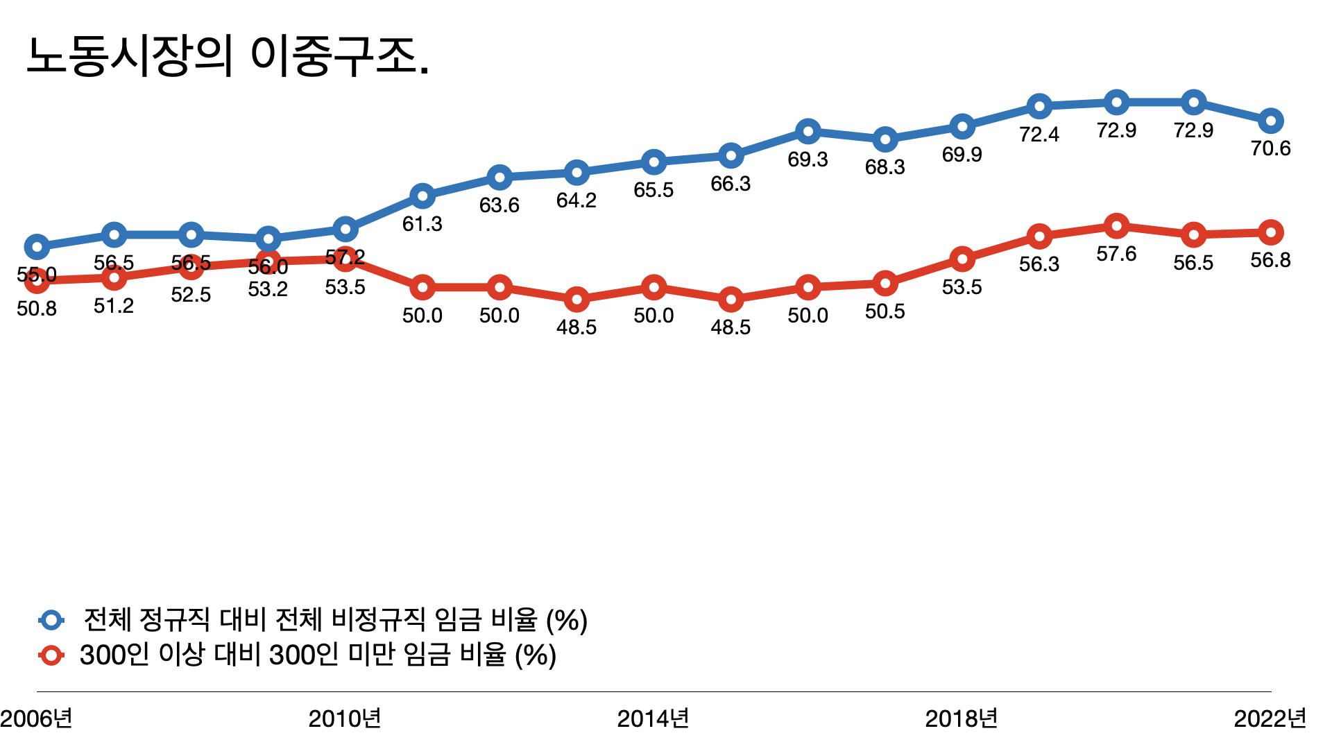 - 임시 일용직 노동자의 월 평균 임금은 179만 원으로 정규직 노동자 421만 원의 절반에도 못 미쳤다. 300인 이상 사업장과 그 이하 사업장의 임금 격차도 크다.