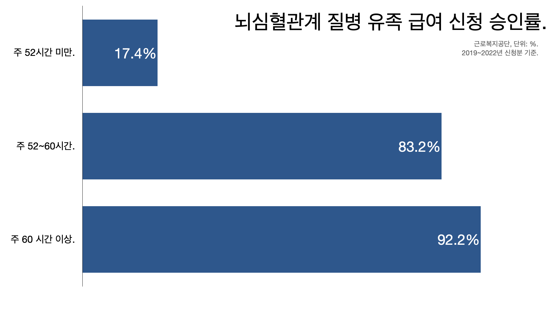 - 주 60시간 근무만 해도 고용노동부의 과로사 기준을 초과한다. 주 60시간 이상 근무한 노동자의 뇌혈관계 질병 산재 승인율은 93%에 이른다. 52시간 이하에서 승인율은 10~20% 수준인 것과 비교된다.