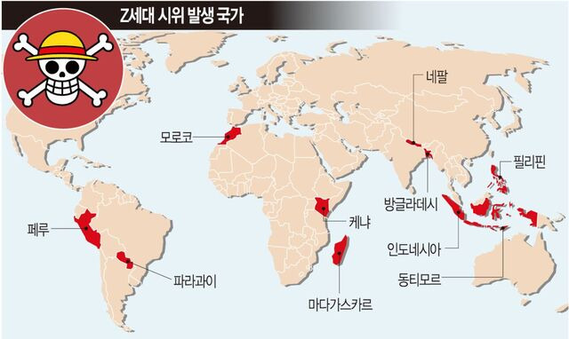 일본 만화 ‘원피스’에 나오는 밀짚모자를 쓴 해골 해적기가 시위 곳곳에서 활용되고 있다는 것도 공통점이다. 이 만화는 단행본으로 출간돼 전 세계적으로 5억부 이상 판매됐다. 해골 모양 깃발은 주인공 루피가 이끄는 해적단의 트레이드마크인데, Z세대 시위대는 저항과 공감의 상징으로 해적기를 사용한다. 네팔에서 시위대가 정부 청사 앞에 이 깃발을 걸기도 했다.