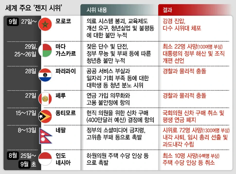 경제난 속에 잇따른 물·전기 부족이 시위를 촉발한 아프리카 마다가스카르는 군과 경찰까지 시위대를 지지하며 지난주 대통령을 탄핵시켰다. 국회의원이 최저 임금 10배 수준의 주택수당을 받는다는 소식이 지난 8월 거센 시위를 부른 인도네시아에서는 대통령이 중국 방문 일정까지 취소하며 의원 수당 폐지 등 수습에 나섰다. 페루, 파라과이, 동티모르, 필리핀 등에서도 Z세대를 중심으로 한 '변화' 요구 시위가 이어졌다.