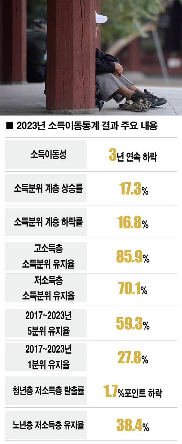 계층 간 문턱은 더 높아졌다. 2023년 소득분위 이동성은 34.1%로 전년보다 0.8% 포인트 떨어졌다. 65.9%는 한해 전과 같은 소득분위를 유지했다는 의미다. 소득 이동성은 2021년부터 3년째 하락 흐름이다. 사회 이동성이 갈수록 낮아지며 경직된 사회가 되어가고 있다는 얘기다.