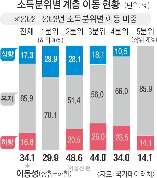 최바울 국가데이터처 경제사회통계연구실장은 “국제 비교 기준은 없지만, 소득분위 이동성이 40∼50% 이상이면 사회가 불안정한 상태로 해석될 수 있다”면서 “현재의 30%대(17.3%+16.8%=34.1%)는 비교적 안정적 범위”라고 설명했다.