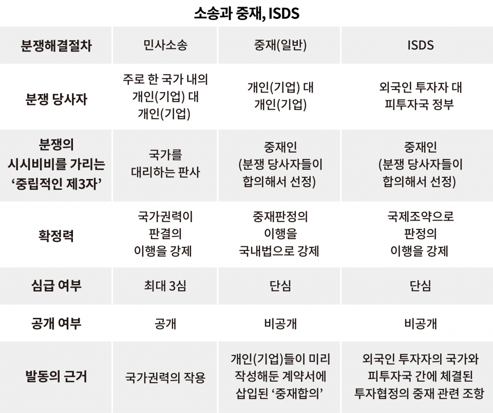 미국의 두 거대 사모펀드 엘리엇과 메이슨이 우리 정부를 상대로 제기한 삼성물산 합병 관련 투자자-국가분쟁해결(ISDS) 소송을 비롯해 우리 정부가 피소된 ISDS 사건은 2022년 기준 총 10건이다. 하지만 지난 50여년간 국제 무역투자협정에서 선진국 금융투자자본이 막강한 위세를 휘둘러온 이 ISDS 제도는 ”이제 폐기·개혁하자”는 흐름이 미국에서조차 이미 일어나고 있다. 최근 세계무역기구(WTO)의 투자원활화협정 협상에서도 민감한 투자분쟁 제도는 협의 대상에서 제외하고 있고, 뉴질랜드·호주 등은 ISDS 협정에서 이탈하는 등 ’ISDS 국제 투자체제’가 크게 흔들리고 있다.