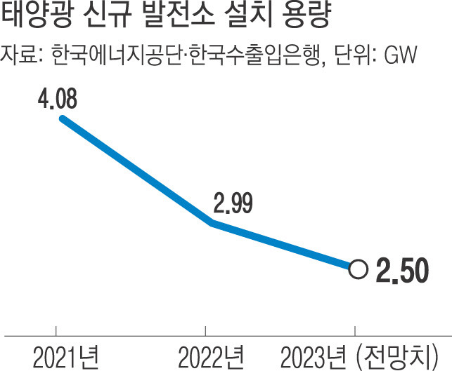 10일 한국수출입은행에 따르면 올해 국내 태양광 신규 설비 규모는 전년 대비 약 17% 감소한 2.5GW에 그칠 것으로 예상된다. 태양광 신규 설비는 2020년 4.12GW로 정점을 찍은 이후 감소 추세를 보이고 있다.