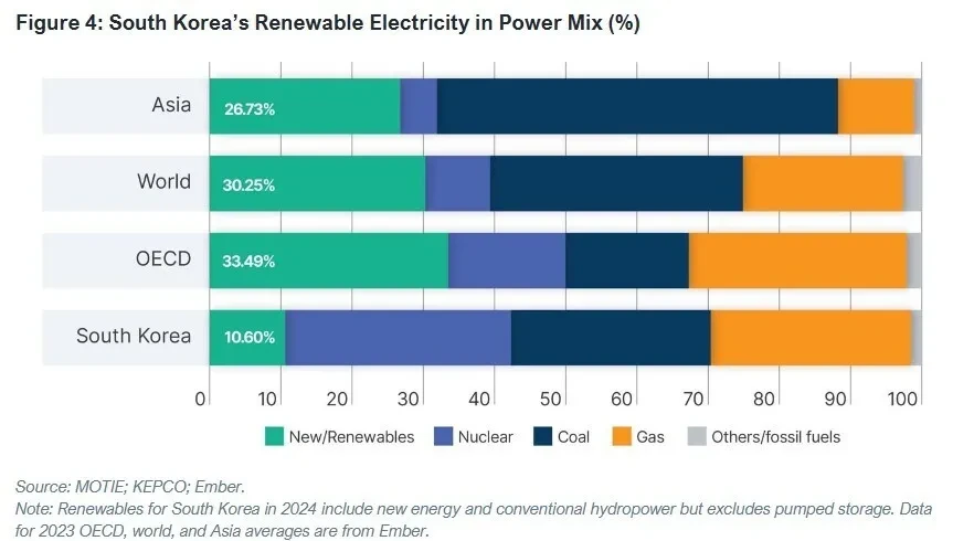 이런 병목 요소들이 서로 얽혀, 우리나라는 주요 국가들에 견줘 재생에너지 발전이 “최소 15년 이상 뒤처졌다”고 보고서는 꼬집었다. 2024년 기준으로 재생에너지 발전 비중 10%란 수치는 전세계(30.25%)는 물론 경제협력개발기구(33.49%), 아시아(26.73%) 평균에도 크게 못 미친다. 따라서 보고서는 “한국이 재생에너지의 양적 성장에서 질적 성장으로 도약하기 위해서는 앞서 언급한 세 가지 주요 병목 요인을 제거하고 더 유기적이고 통합된 제도 개선이 시급하다”고 진단했다.