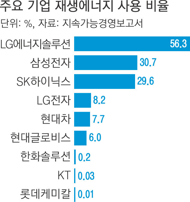 LG에너지솔루션은 지난해 전체 소비전력에서 재생에너지 비중이 56%에 달해 30대 기업 중 유일하게 50%를 웃돌았다. 삼성전자(30.7%)와 SK하이닉스(29.6%)도 재생에너지 확대에 속도를 내고 있다. 2020년에 미국과 유럽, 중국 공장에서 재생에너지로 100% 전환한 삼성전자는 지난해는 베트남·인도·브라질 공장도 재생에너지로 전력을 모두 충당하고 있다. SK하이닉스도 지난해 해외 사업장만 RE100을 달성했다.