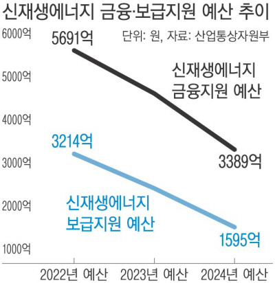 신재생에너지 보급 지원 사업은 신청자가 몰려 2020년부터 2022년까지 3년 동안 신재생에너지 생산량 목표치를 초과 달성했다. 그러나 2022년 3214억원이던 정부 예산이 올해는 2470억원, 내년에는 1595억원으로 줄어들게 되면서 신재생에너지 생산량도 2022년 7만3600TOE(석유환산톤)에서 내년에는 목표치 기준 3만6300TOE로 반토막이 났다.