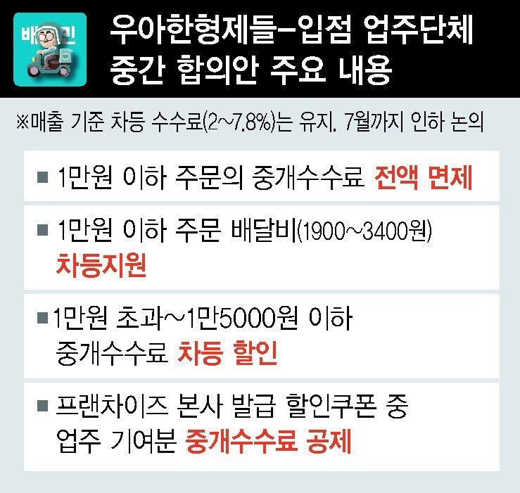 중간 합의안에는 1만원 이하 주문의 경우 중개수수료를 전액 면제하고 1900~3400원에 이르는 점주 부담 배달비를 배민이 차등 지원한다는 내용이 담겼다. 1만~1만 5000원 이하 주문에 대해서도 중개수수료를 배민이 차등 지원할 예정인데 구체적인 내용은 추후 정해질 것이라고 회사 측은 밝혔다.