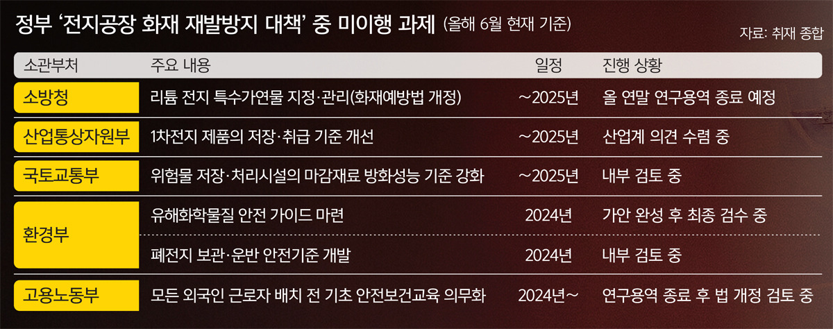 '소 잃고 외양간 고치기'의 전형이라는 비판이 나온다. 화성 아리셀 전지공장 화재 사고는 23명의 인명피해를 낳으면서 화재 예방 중요성이 상기되고 있다. 하지만 다른 업종에서 발생하는 화재를 막으려면 지금의 정부 대처만으로 부족하다는 지적이다.